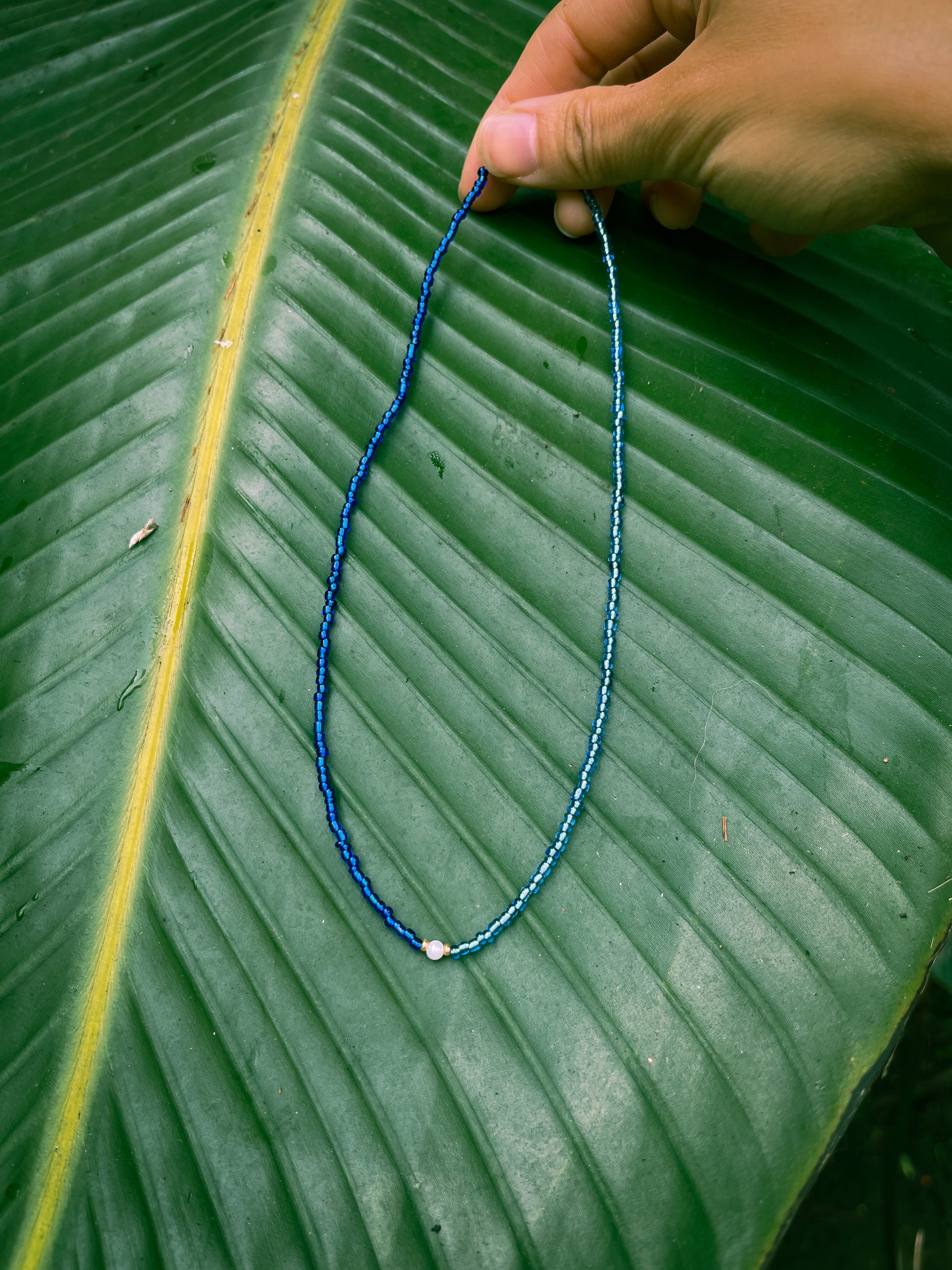 Changing Tides is a handmade necklace with two toned blue glass seed bead and a freshwater pearl. Strung on durable stainless steel wire with sterling silver clasps.